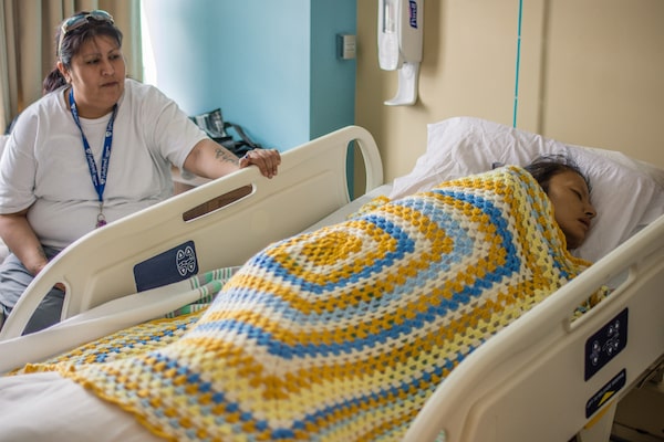 File photo shows Barbara Kentner lying in St. Joseph's Hospital in Thunder Bay, Ont., days before she died on July 4, 2017, as her sister Melissa watches over her.Willow Fiddler/Courtesy of APTN