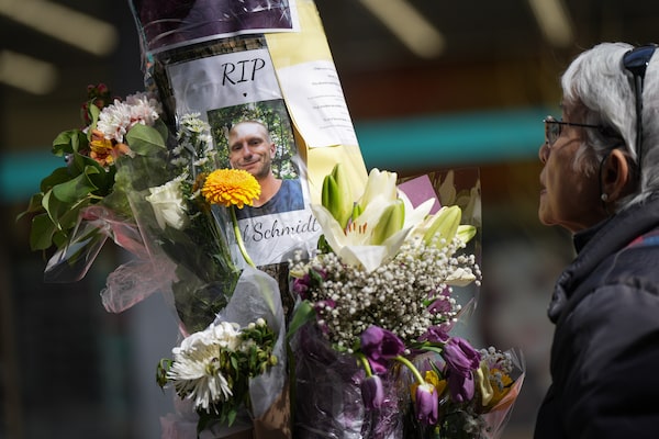 A woman pauses on on March 29 at a makeshift memorial for Paul Stanley Schmidt, 37, who died Sunday after being stabbed outside a Starbucks in downtown Vancouver. Vancouver police say Inderdeep Singh Gosal, 32, has been charged with second-degree murder and investigators do not believe the suspect and victim knew each other.DARRYL DYCK
