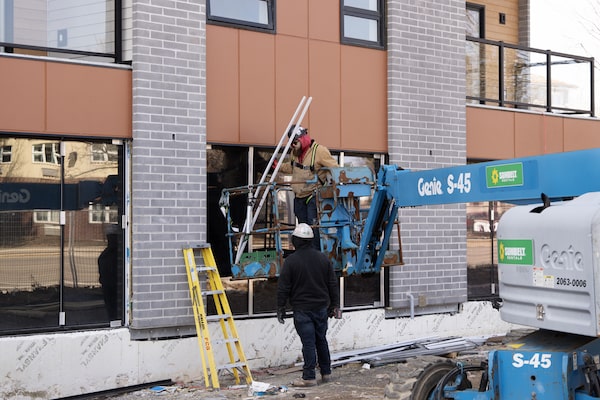 Connor MacLeod, top, helps a colleague install windows on a new apartment building. He says his services have been in high demand recently.