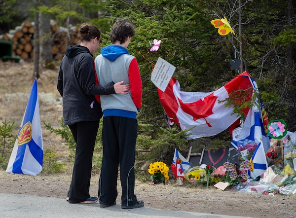 Visitors pay their respects at a roadside memorial in Portapique, N.S.Andrew Vaughan