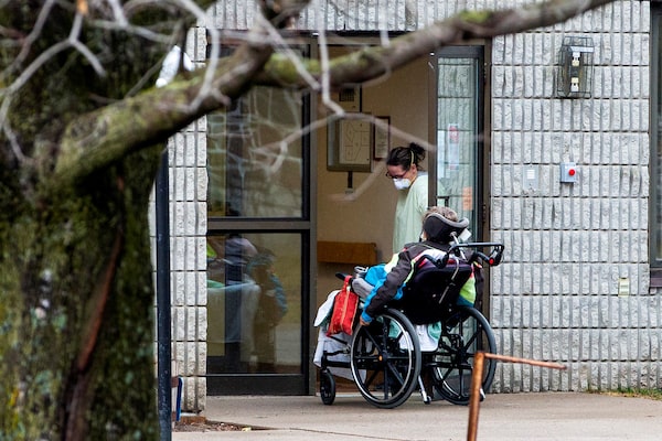 A woman opens the door to a person in a wheelchair at Pinecrest Nursing Home in Bobcaygeon, Ont., on March 30, 2020.CARLOS OSORIO/Reuters