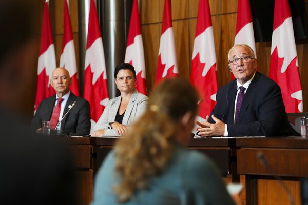 Conrad Sauvé, President and CEO of the Canadian Red Cross, left to right, Janelle Coultes, President of the Search and Rescue Volunteer Association of Canada (SARVAC), Bill Blair, Minister Emergency answer reporters questions during a press conference in Ottawa on July 11.Sean Kilpatrick/The Canadian Press