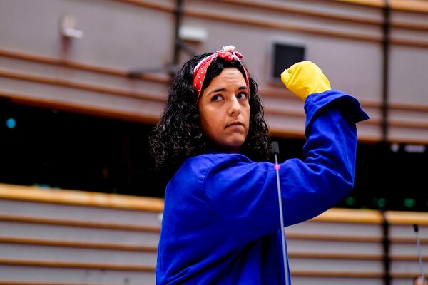 French leftist La France Insoumise (LFI) party's member of European Parliament, Manon Aubry, dressed as Rosie the Riveter gestures as she gives a speech for the International Women's Day, in an empty hemicycle during a plenary session which is reduced to a single day due to the spread of the COVID-19 illness, in Brussels, on March 10, 2020.KENZO TRIBOUILLARD/AFP/Getty Images