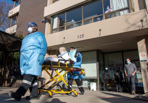 A resident is taken to a waiting ambulance as nurses and PSWs at Sienna Senior Living St. George Care Community in Toronto watch from the windows as a support rally takes place in front of the building on Jan. 7, 2021.Frank Gunn/The Canadian Press