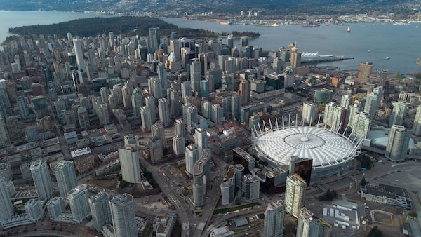 An aerial view of the retractable roof the BC Place Stadium in Vancouver on Friday. FIFA organizers have cancelled between 70 per cent and 80 per cent of their booked hotel rooms in the city, the British Columbia Hotel Association says.Elizabeth Ruiz Ruiz/Getty Images