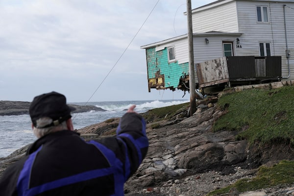 A person points towards a damaged house after the arrival of Hurricane Fiona in Port Aux Basques, Newfoundland, Sept. 25, 2022.JOHN MORRIS/Reuters