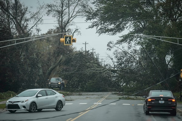 Vehicles turn around as trees and downed power lines block a road in Reserve Mines, Nova Scotia. Formerly Hurricane Fiona, the storm is one of the strongest Atlantic Canada has seen in years.Drew Angerer/Getty Images