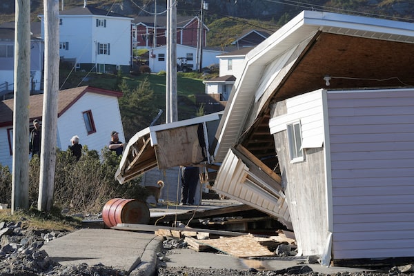 People remove items from damaged buildings that were moved from their position by the hurricane in the aftermath of Hurricane Fiona in Port Aux Basques, Newfoundland, Sept. 25, 2022.JOHN MORRIS/Reuters