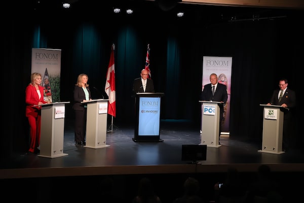 Ontario Liberal Leader Bonnie Crombie, left to right, Ontario NDP Leader Marit Stiles, moderator CBC Radio Morning North host Markus Schwabe, Ontario Progressive Conservative Party Leader Doug Ford and Ontario Green Leader Mike Schreiner take part in the Ontario election debate in North Bay on Feb. 14.Gino Donato/The Canadian Press