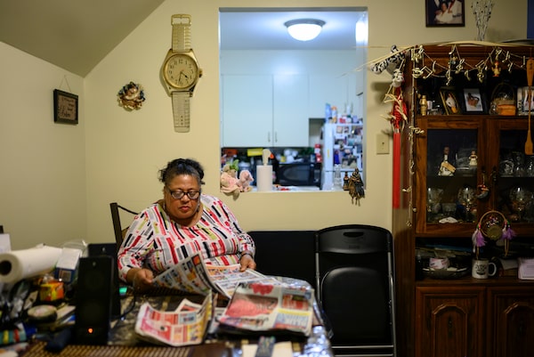 Sharon Johnson, who raised her kids as a single mother on social assistance visiting food banks, looks through grocery flyers at her home in Uniacke Square in Halifax, N.S. on Oct. 23, 2019.Darren Calabrese/The Globe and Mail