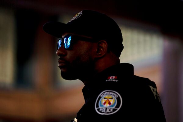 A Toronto officer looks on at the anti-police sit-in on June 19.Carlos Osorio/Reuters/Reuters