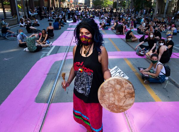 Demonstrator Mahlikah Awe:ri and thousands of others take part in a June 19 protest in Toronto where the words 'defund the police' were painted on the street.Nathan Denette/The Canadian Press/The Canadian Press
