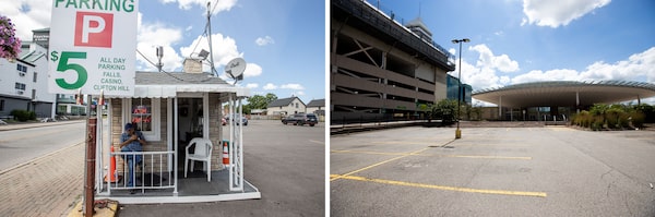 Mike Piccirillo, left, has operated a parking lot on Centre Street for 18 years, and this summer, it's emptier than it's ever been. There are also lots of vacant parking spots at Casino Niagara, right, one of the two casinos that have been closed since March.