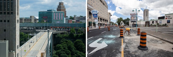 The Rainbow Bridge, left, would usually have lots of tourists driving between the Ontario and New York sides, but now it's closed to all but essential traffic. The only upside for the City of Niagara Falls is that work crews like the one at right have more room to repair roads near the crossing.