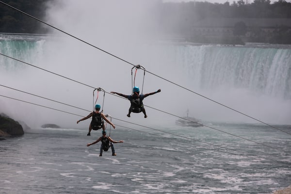 Visitors ride on a zipline as a Hornblower cruise takes visitors closer to the falls. Normally, the boat tours can carry up to 700 people, but now they allow only six per sailing with a $69.95 'VIP charter package.'