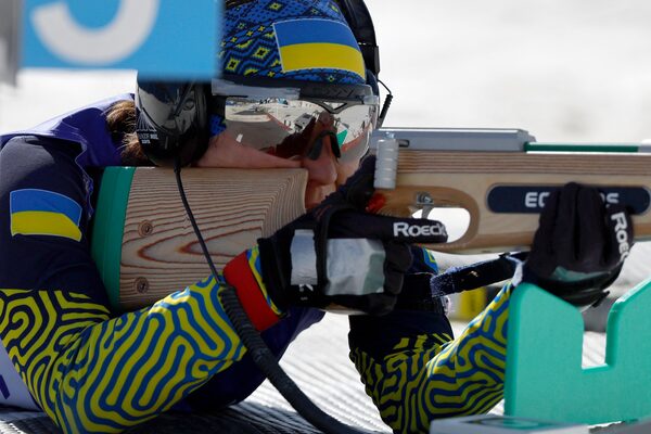 Oksana Shyshkova of Ukraine in action at March 8's para biathlon (middle distance vision impaired). She won silver here and gold in a different biathlon event the day before.Issei Kato/Reuters