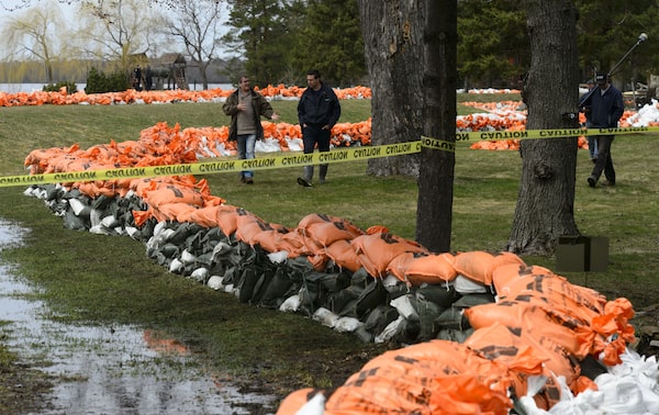 People survey the flood risk as work is done to hold back floodwaters on the Ottawa River in Britannia Bay, Ont.Sean Kilpatrick/The Canadian Press
