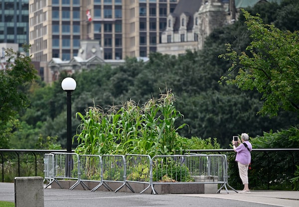 A person takes a photo of corn and other vegetables growing in a planter box surrounded by metal fencing, at Major's Hill Park in Ottawa, on Wednesday, July 31, 2024Justin Tang/The Canadian Press