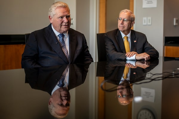 Premier of Ontario Doug Ford, left, and Victor Fedeli, minister of economic development, job creation and trade, visit the Austin Chamber of Commerce on Thursday.Sergio Flores/The Globe and Mail