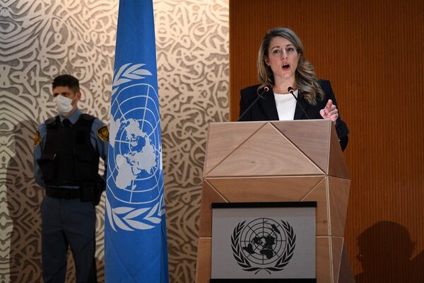 Canadian Foreign Minister Melanie Joly delivers a speech during a session of the UN Human Rights Council, following the Russian invasion in Ukraine, in Geneva, on Feb. 28.FABRICE COFFRINI/AFP/Getty Images