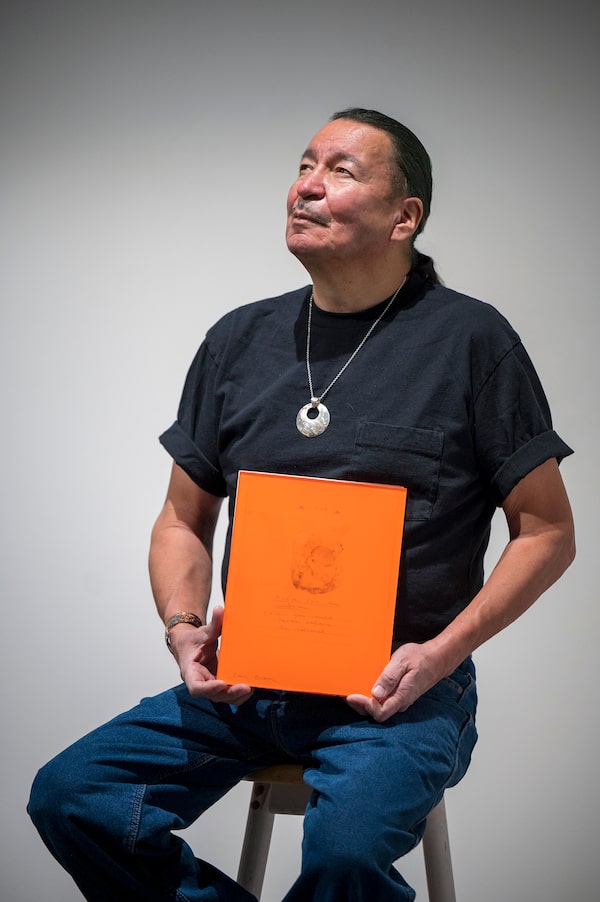 Joe Migwans, Carl Beams's first cousin, holds a print that reminded him of the imagery of Orange Shirt Day, which commemorates residential-school survivors.