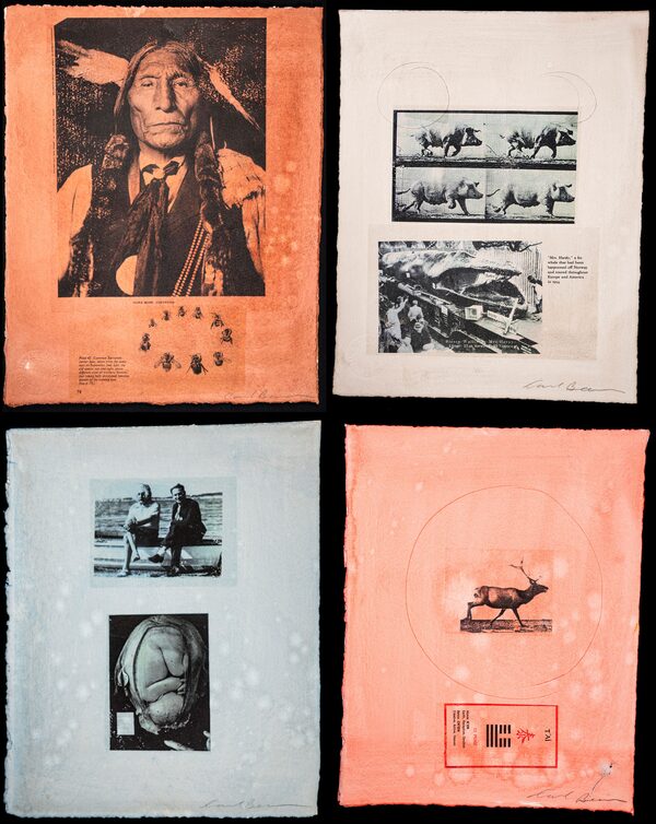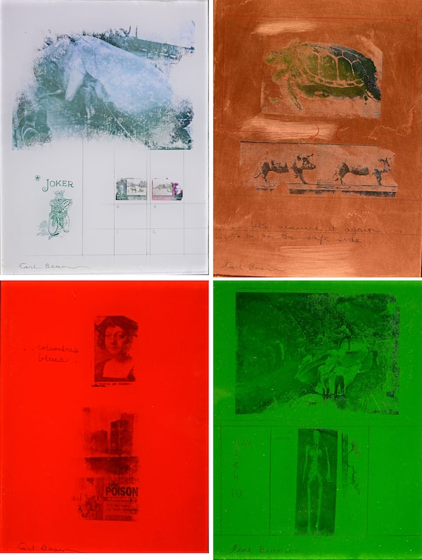 Then Mr. Griffis discovered more dog-eared boxes in the back of a filing cabinet and, days later, even more in another cabinet. The 114 works in these boxes were very different from the first batch of paintings, with photographic images transferred onto coloured plexiglass or stamped print paper. The name scrawled on all these pieces was Carl Beam.