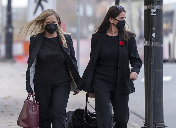 Tracy Kitch, left, the former chief executive of the IWK Health Centre, walks outside the provincial court with her lawyer, in Halifax, on Nov. 8, 2021.Andrew Vaughan/The Canadian Press