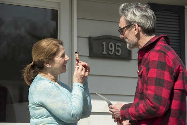 David Myles talks with Gale MacDonald while door knocking in her neighbourhood on April 19, 2025. She shows Mr. Myles a small statue of himself with a banjo, which was made by Premier Susan Holt’s husband Jon for a fundraiser.Stephen MacGillivray/The Globe and Mail