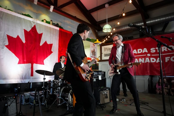 David Myles, right, performs with his band prior to a speech by Prime Minster Mark Carney at a rally in Fredericton, N.B., on April 21, 2025.Sean Kilpatrick/The Canadian Press