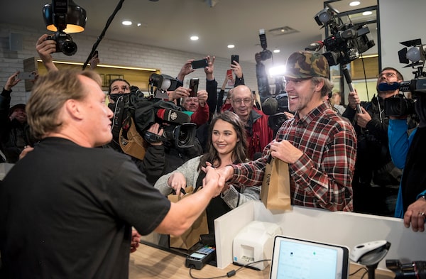 Bruce Linton, left, Co-CEO of Canopy Growth, celebrates with Nikki Rose, centre, and Ian Power following the first legal transaction of recreational cannabis at theTweed retail store in downtown St. John's, N.L. on Wednesday, October 17, 2018.Darren Calabrese/The Globe and Mail