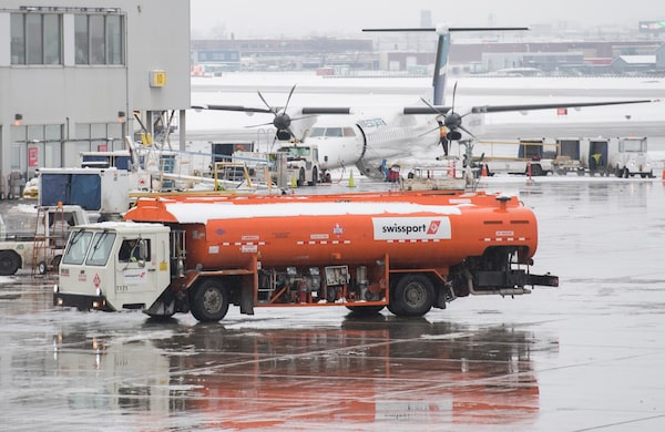 A Swissport refuelling truck is shown at Pierre Elliott Trudeau Airport in Montreal on December 31, 2019.Graham Hughes/The Canadian Press