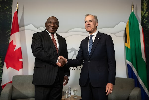 Prime Minister Mark Carney, right, meets South African President Cyril Ramaphosa, as the G7 gets under way in Calgary, Alta., on Sunday.JASON FRANSON/The Canadian Press