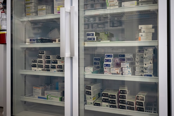 Boxes of semaglutide injection pens on a shelf inside a fridge at Durham Care Clinic and Pharmacy in Oshawa, Ont. Obesity experts say one solution to helping those who are prescribed the drug by their doctors but can’t access it financially is to have public health plans step in.EDUARDO LIMA/The Globe and Mail