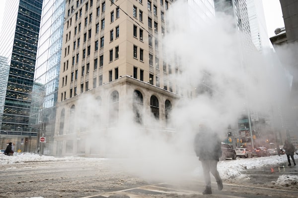 A person walks through steam from a vent following a heavy snowfall in Toronto, on Feb. 13.Arlyn McAdorey/The Canadian Press