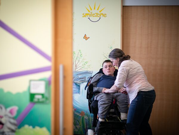 Toronto, Feb. 27: Burton Goicoechea sits in his powered wheelchair at Holland Bloorview Kids Rehabilitation Hospital alongside his mother, Jan Genge. The 15-year-old Burton has spinal muscular atrophy, a rare genetic disorder.