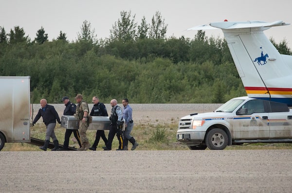 Gillam, Man., Aug. 7: RCMP load human remains onto a plane after a weeks-long manhunt for two murder suspects. The bodies, discovered in the remote northern Manitoba woods, were flown to Winnipeg for an autopsy that would confirm they belonged to Bryer Schmegelsky and Kam McLeod.