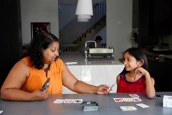 Newmarket, Ont., Aug. 13: Shameela Shakeel and daughter Yasmeen, 8, play a card game at home. Yasmeen struggled with anxiety in her previous year at school, where another student acted violently in the classroom several times.