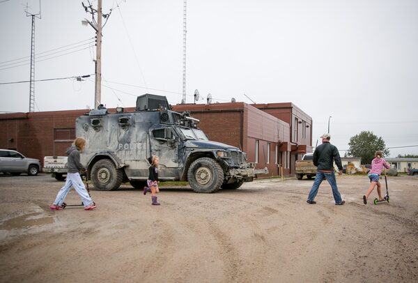 Gillam, Man., July 26: Local resident Alex Muzyczka takes daughters Vada, Adelle and Frankie out for an errand, passing an RCMP armoured vehicle brought for the manhunt. By this point, it was four days since the fugitives were last seen.