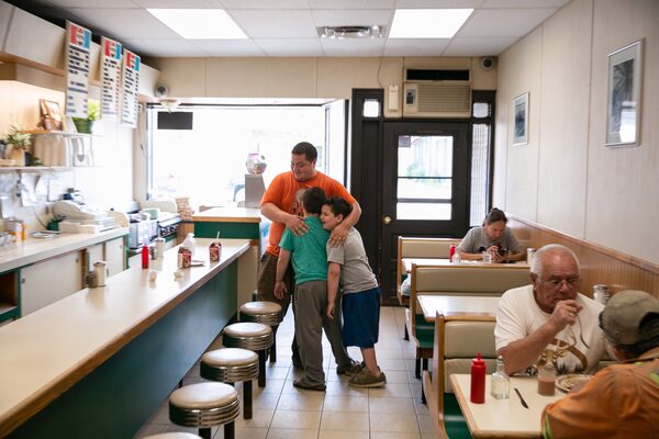 Thunder Bay, July 24: Jake MacLaurin hugs his sons Odin, 7, and Donald, 10, after a meal at the Coney Island Westfort diner.