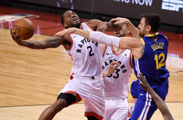 Toronto, June 2: Raptors forward Kawhi Leonard runs into heavy traffic with centres Marc Gasol of the Raptors and Andrew Bogut of the Golden State Warriors during Game 2 of the NBA finals.