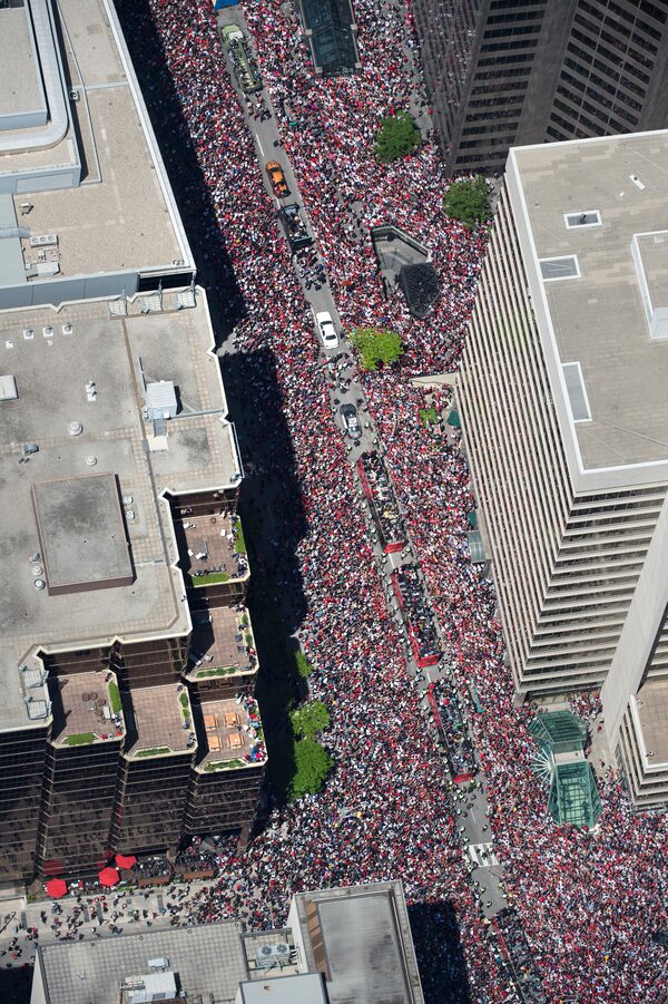 A few days before June’s parade for the Toronto Raptors, the newest NBA champions, editors decided that we wouldn’t go with two photographers on the ground. My task was to go up in a helicopter and try to capture the expected million-plus fans that would be lining the streets of downtown Toronto.