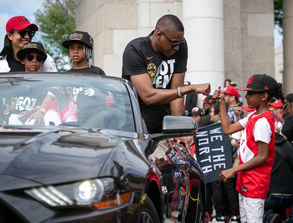 This photo was created at the start of the parade under the Princes’ Gates at the CNE. Raptors president Masai Ujiri and his family were in a car together. The parade was stopped when a young fan mustered the courage to walk up to Mr. Ujiri and ask for an autograph. They shared a fist bump and the young fan slipped back into the crowd. It was a sweet, subtle moment between Mr. Ujiri (who is only the second black NBA executive to win a championship) and the young fan.