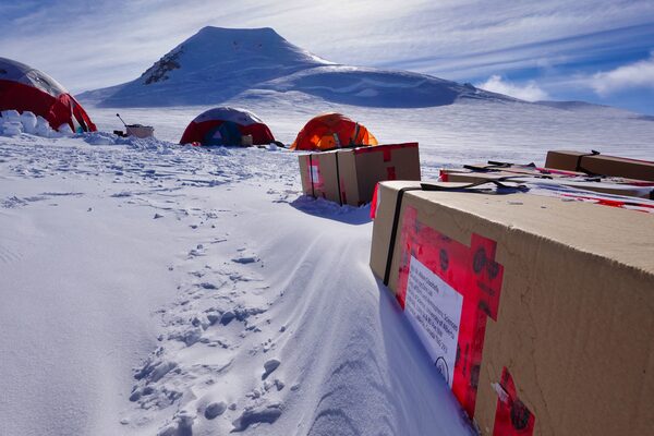 Segments of ice core that have been packed and boxed await pick up by helicopter from the summit plateau of Mount Logan.Rebecca Haspel/Supplied