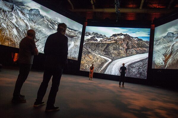 Photographer Ed Burtynsky (2nd from left) checks the last details before the opening of his Luminato show 'In the Wake of Progress' at the Canadian Opera Company theatre, Toronto, June 24, 2022.Eduardo Lima/The Globe and Mail