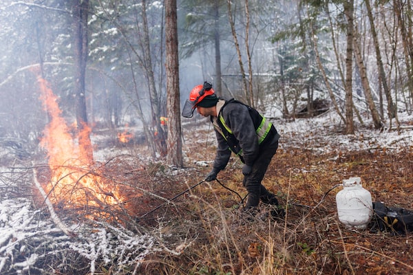 It’s late December in the mountain forest outside Lee Creek, in British Columbia’s North Shuswap. He’s placing a propane torch into a pile of snow-soaked branches trying to get them to burn as part of wildfire fuel mitigation project.