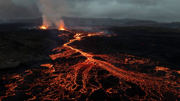 In this aerial view, lava flows from the Sundhnúkur volcano on the Reykjanes peninsula on May 30, 2024 near Grindavik, Iceland. The volcano, located in southwestern Iceland, erupted anew the day before, cutting electricity to Grindavik and forcing the evacuation hundreds of guests at the nearby Blue Lagoon geothermal spa. The volcano has erupted five times since December.John Moore/Getty Images