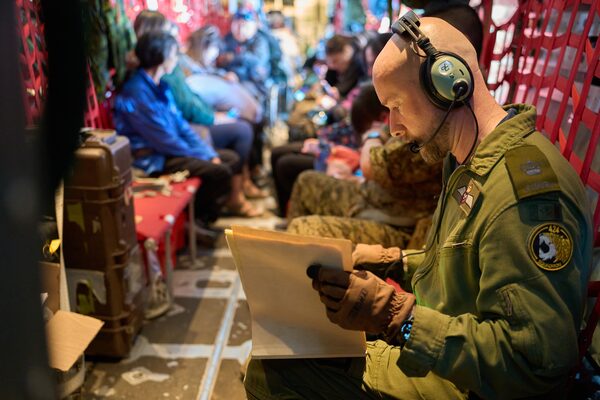 Royal Canadian Air Force Warrant Officer Tyler Ashbee sits among evacuees from Pinaow Wachi Care Home flying from Norway House, Man., to Winnipeg on June 3 as crews continue to fight wildfires.David Lipnowski/The Canadian Press