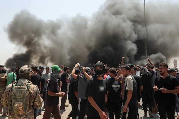 People block a road as they protest water shortages and the drying up of rivers, in the Al-Majriya area of central Iraq's Hilla city on July 25. Hundreds protested severe water shortages exacerbated by the summer's sweltering heat in the central province of Babylon, an AFP correspondent said, as Iraq, and its 46 million inhabitants, have been intensely impacted by the effects of climate change, experiencing rising temperatures, year-on-year droughts and reduced river flows.KARRAR JABBAR/AFP/Getty Images