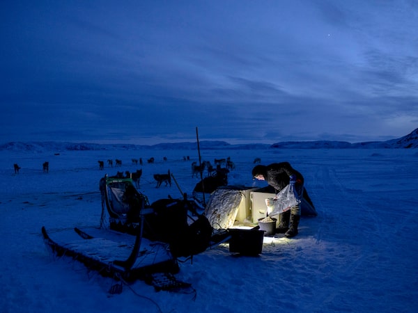 After a long day fishing on a frozen ice fjord, Hans Sandgreen prepares to feed his sled dogs before returning home, near Ilulissat, Greenland. Amid dizzying changes caused by a warming climate and global attention, Greenlanders don't want to have to choose between embracing the future and honoring their heritage.IVOR PRICKETT/The New York Times News Service
