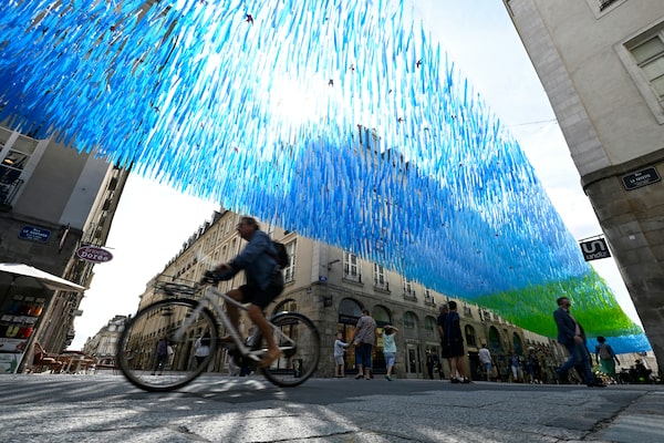 A man rides his bicycle under a shading device to fight excessive heat on a downtown shopping street in Rennes, western France, on July 20, 2023, as Europe is hit by a major heatwave.DAMIEN MEYER/AFP/Getty Images